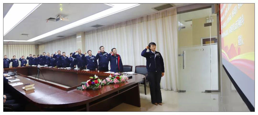 會議開始,在集團領導的見證下,中層干部代表任燕帶領新任命的中層干部們面向國旗和司旗進行了莊嚴、鄭重的任職宣誓。